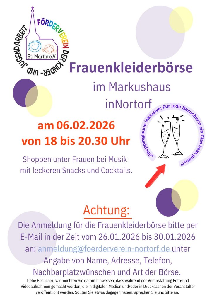Kommt zu unserer beliebten Frauenkleiderbörse. Dieses Jahr gibt es für jede Besucherin ein Glas Sekt / Prosecco gratis. Außerdem wird es eine Schätztombola geben mit der Chance, eine kleine Wellness-Auszeit zu gewinnen. Lasst Euch das nicht entgehen!