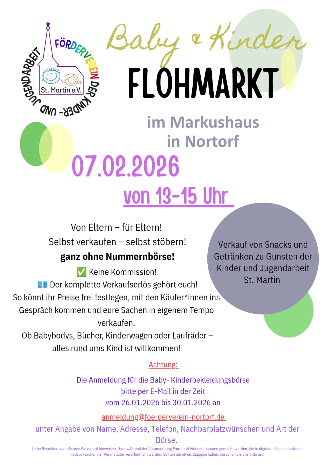 | | | 07.02.2026 | 13:00-15:00 | Baby- und Kinderflohmarkt | Markushaus | https://foerderverein-nortorf.de/wp-content/uploads/2026/01/ea512a65-ca87-4bd2-bf33-85f565f3e1ec.jpeg |